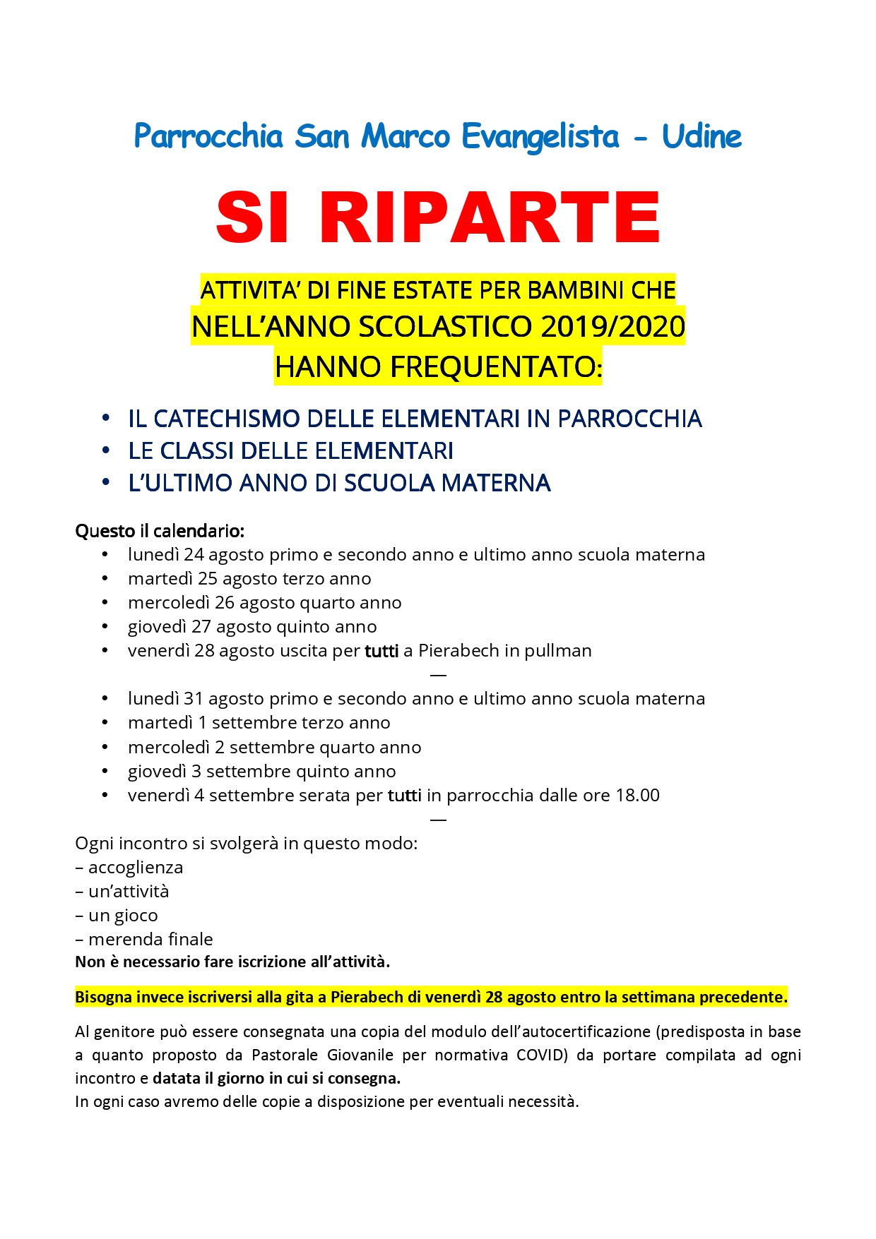 Con martedì 8 e mercoledì 9 settembre riprende il catechismo del 4° e 5° anno (anno scolastico 2020/2021) con la preparazione alle prime confessioni e prime comunioni che dovevano essere celebrate nella primavera di quest’anno.