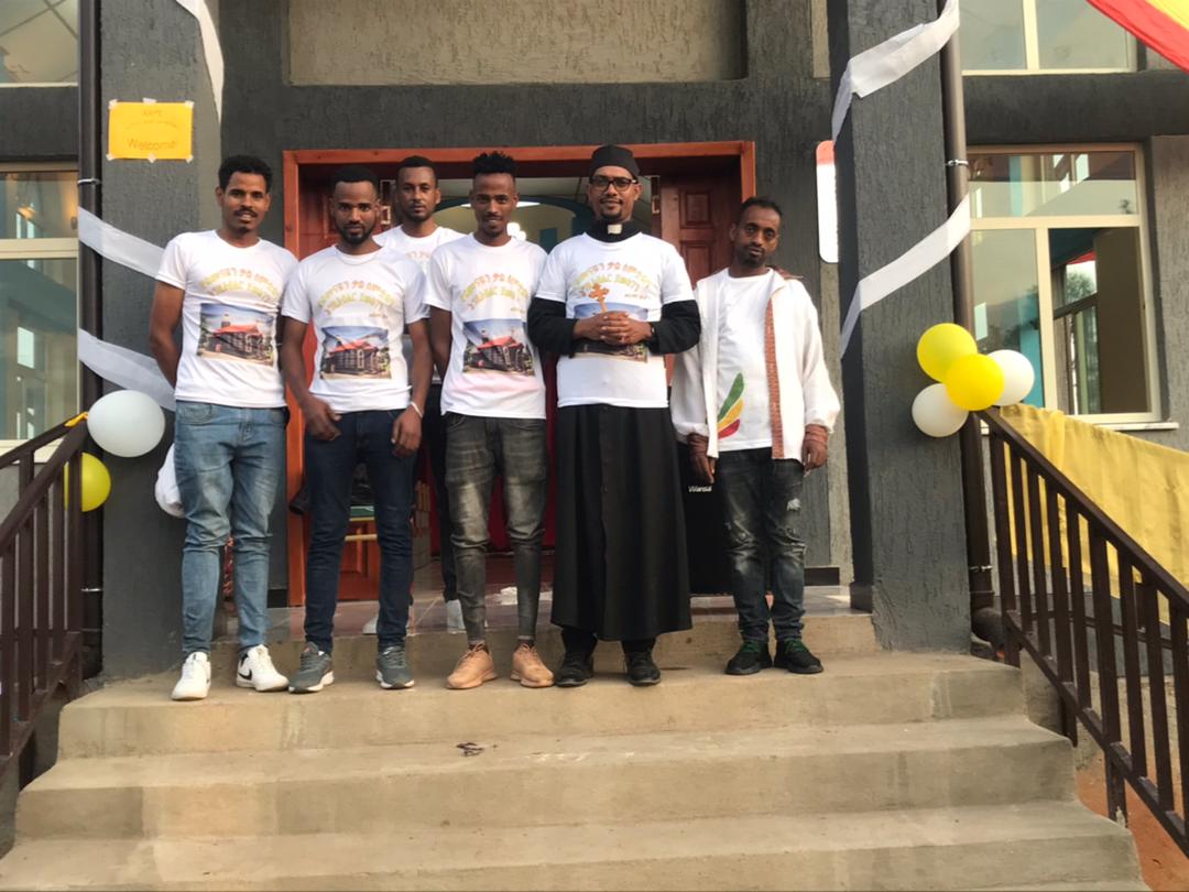 Alcuni giovani di Bazreche con le magliette della nuova chiesa e con il loro parroco Abba Wasihun