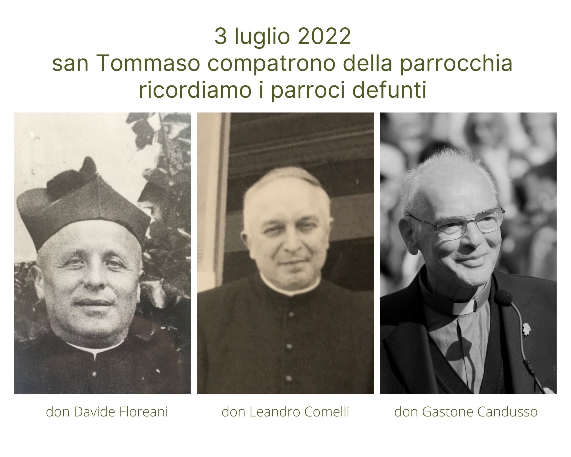A tutte le messe ricorderemo i parroci defunti: don Davide Floreani, don Leandro Comelli e don Gastone Candusso.