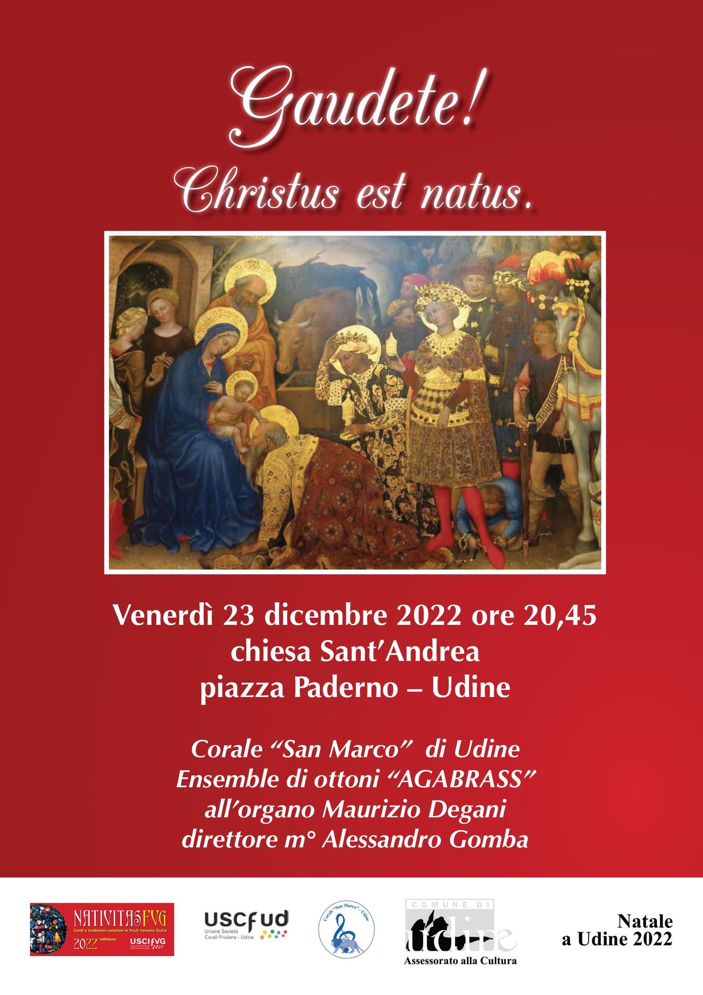 La Corale “San Marco”, propone il concerto dal titolo “Gaudete! Christus est natus” in collaborazione con l’ensemble di ottoni “AGABRASS” e l’organista Maurizio Degani, dirige il m° Alessandro Gomba.