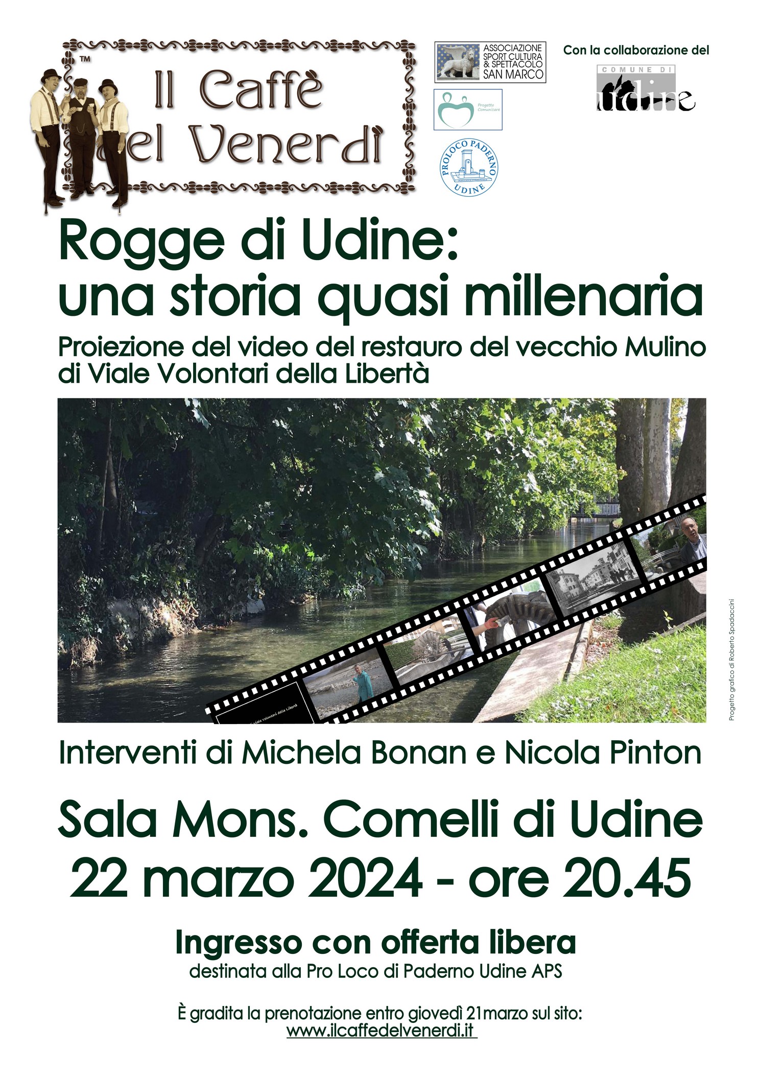 presenta, in collaborazione con il Comune di Udine, la serata “ROGGE DI UDINE: UNA STORIA QUASI MILLENARIA” con la proiezione del video del restauro del vecchio Mulino di Viale Volontari della Libertà e gli interventi di Michela Bonan e Nicola Pinton.