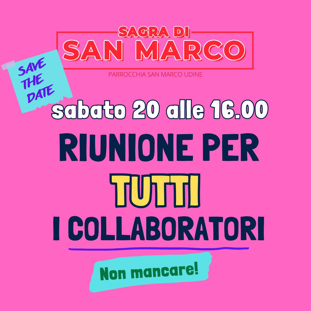 Sabato 20 aprile alle ore 16.00 tutti i collaboratori che parteciperanno alle varie attività della sagra sono invitati per un momento di preghiera iniziale e per comunicazioni organizzative.
