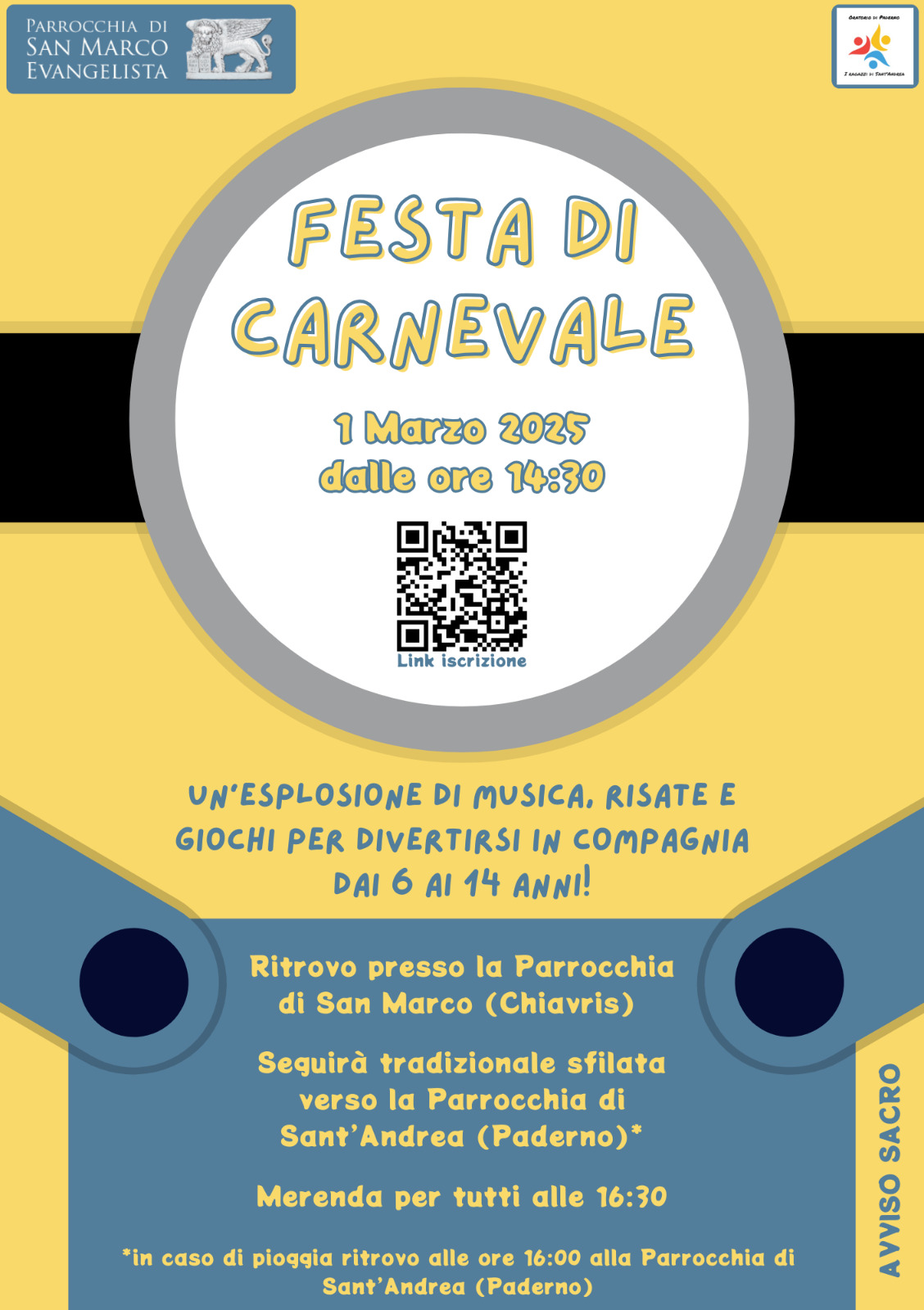 Ritrovo alle 14.30 a S. Marco: giochi e a seguire la sfilata verso la parrocchia di Paderno. Iscrizioni attraverso il link https://docs.google.com/forms/d/e/1FAIpQLScBF7RAlmYrnagBsE3AyeRg6RYawcZsI_7DszyRg05GvtjzHA/viewform